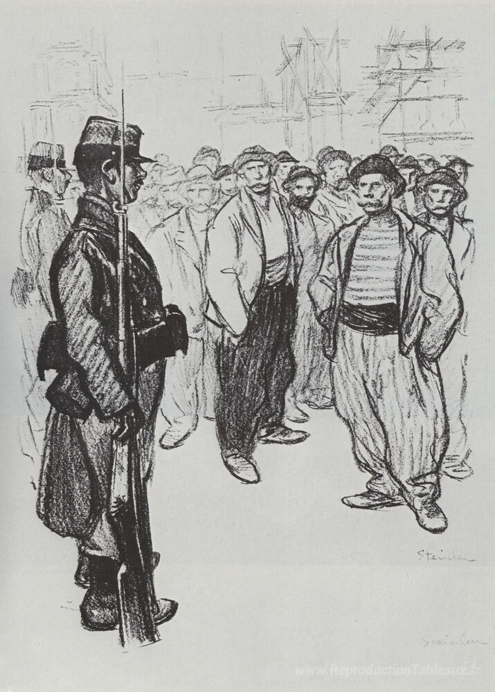 Nous vous proposons une reproduction artisanale sur toile du célèbre tableau 'La Grève des Juifs' de Theophile Steinlen, provenant du Musée de la Reproduction.