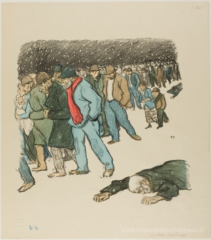 Nous vous proposons une reproduction artisanale sur toile du célèbre tableau 'La Misere sous la neige' de Theophile Steinlen, provenant du Musée de la Reproduction.