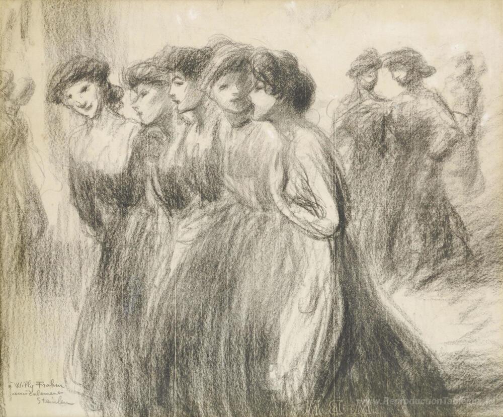 Nous vous proposons une reproduction artisanale sur toile du célèbre tableau 'La Sortie des Ouvrières' de Theophile Steinlen, provenant du Musée de la Reproduction.