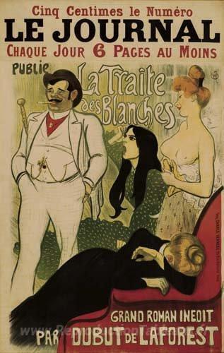 Nous vous proposons une reproduction artisanale sur toile du célèbre tableau 'La Traité des Blanches' de Theophile Steinlen, provenant du Musée de la Reproduction.