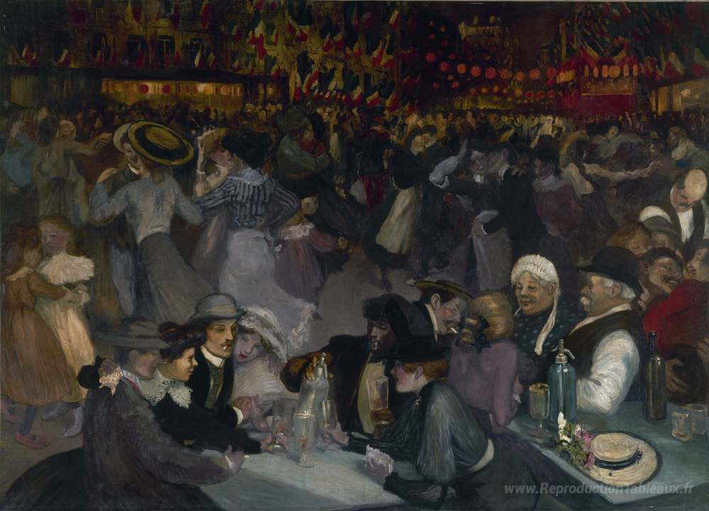 Nous vous proposons une reproduction artisanale sur toile du célèbre tableau 'Le bal du 14 juillet' de Theophile Steinlen, provenant du Musée de la Reproduction.