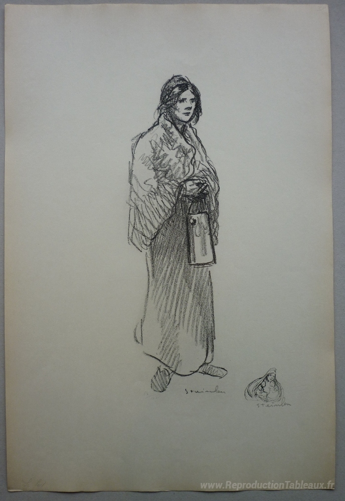 Nous vous proposons une reproduction artisanale sur toile du célèbre tableau 'Le Lait' de Theophile Steinlen, provenant du Musée de la Reproduction.