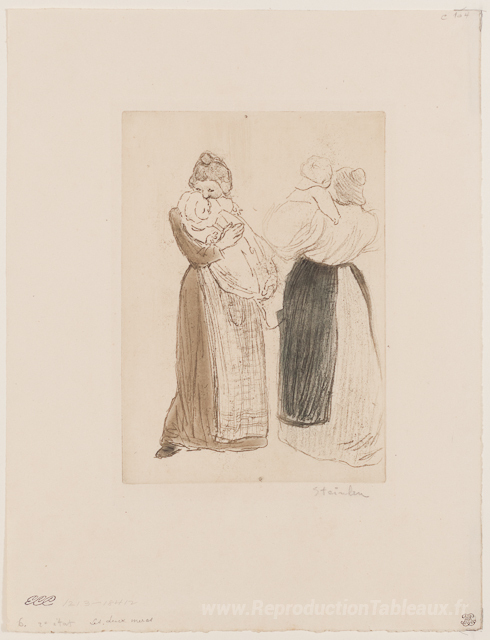 Nous vous proposons une reproduction artisanale sur toile du célèbre tableau 'Les Deux Meres' de Theophile Steinlen, provenant du Musée de la Reproduction.