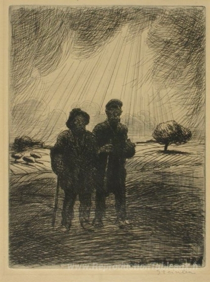 Nous vous proposons une reproduction artisanale sur toile du célèbre tableau 'Les Deux Vagabonds' de Theophile Steinlen, provenant du Musée de la Reproduction.