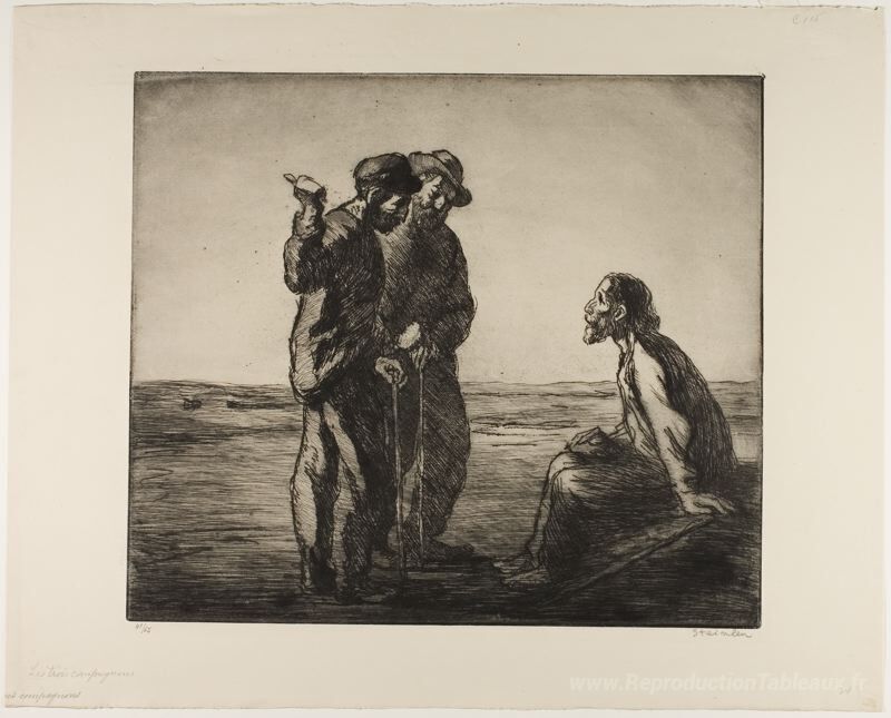 Nous vous proposons une reproduction artisanale sur toile du célèbre tableau 'Les Trois Compagnons' de Theophile Steinlen, provenant du Musée de la Reproduction.
