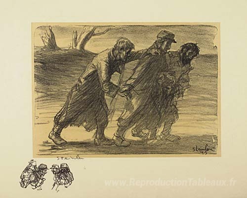 Nous vous proposons une reproduction artisanale sur toile du célèbre tableau 'Les Trois Compagnons' de Theophile Steinlen, provenant du Musée de la Reproduction.