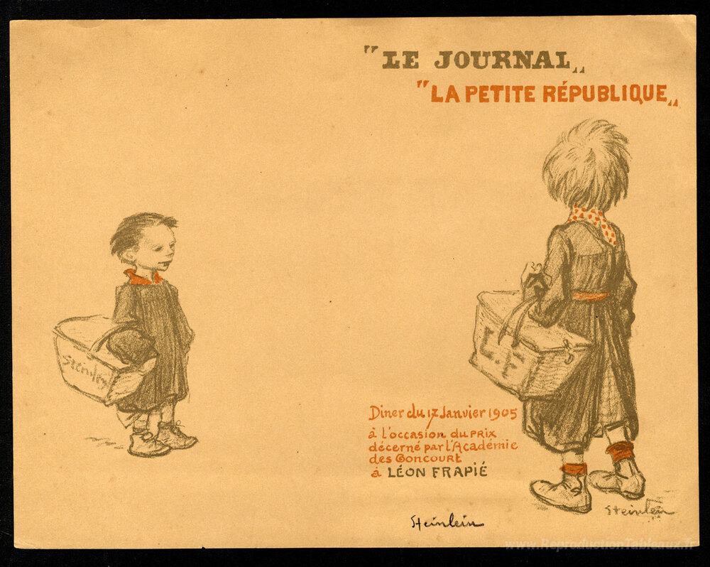 Nous vous proposons une reproduction artisanale sur toile du célèbre tableau 'Menu Leon Frapie' de Theophile Steinlen, provenant du Musée de la Reproduction.