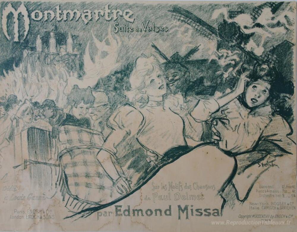 Nous vous proposons une reproduction artisanale sur toile du célèbre tableau 'Montmartre' de Theophile Steinlen, provenant du Musée de la Reproduction.