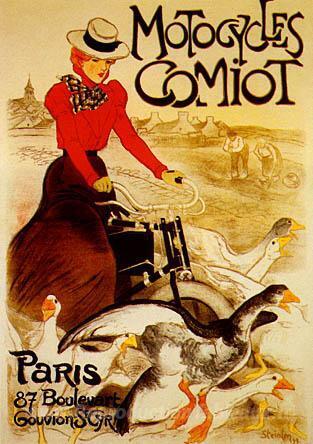Nous vous proposons une reproduction artisanale sur toile du célèbre tableau 'Motociclette Comiot' de Theophile Steinlen, provenant du Musée de la Reproduction.
