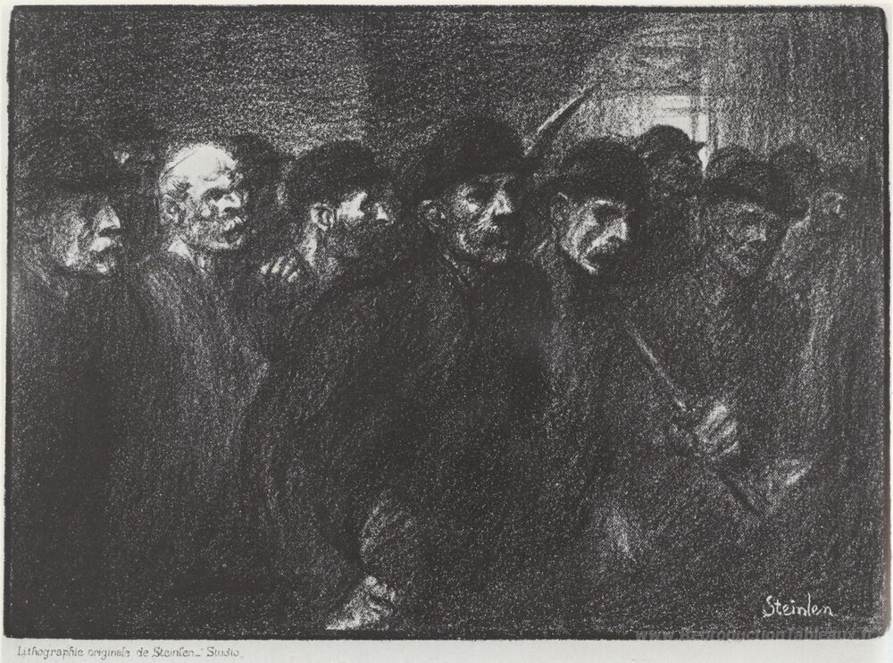 Nous vous proposons une reproduction artisanale sur toile du célèbre tableau 'Ouvriers sort de l'Usine' de Theophile Steinlen, provenant du Musée de la Reproduction.
