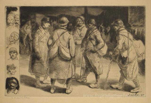 Nous vous proposons une reproduction artisanale sur toile du célèbre tableau 'Permissionnaires no-2' de Theophile Steinlen, provenant du Musée de la Reproduction.