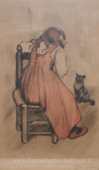 Nous vous proposons une reproduction artisanale sur toile du célèbre tableau 'Petite fille avec chat' de Theophile Steinlen, provenant du Musée de la Reproduction.