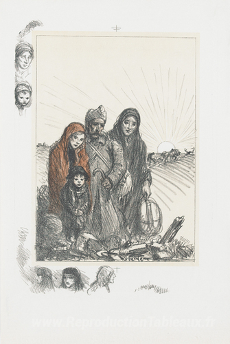 Nous vous proposons une reproduction artisanale sur toile du célèbre tableau 'Sur les ruines de la maison' de Theophile Steinlen, provenant du Musée de la Reproduction.