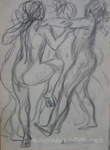 Nous vous proposons une reproduction artisanale sur toile du célèbre tableau 'Trois femmes nues dansant' de Theophile Steinlen, provenant du Musée de la Reproduction.