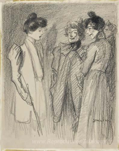 Nous vous proposons une reproduction artisanale sur toile du célèbre tableau 'Trois femmes' de Theophile Steinlen, provenant du Musée de la Reproduction.