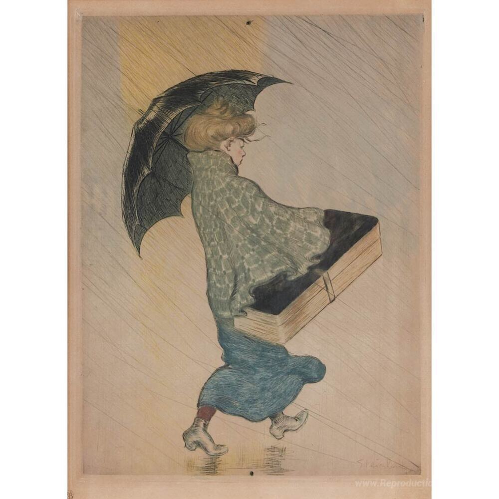 Nous vous proposons une reproduction artisanale sur toile du célèbre tableau 'Trottin Sous La Pluie' de Theophile Steinlen, provenant du Musée de la Reproduction.