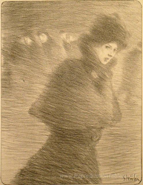Nous vous proposons une reproduction artisanale sur toile du célèbre tableau 'Une Femme Qui Passe' de Theophile Steinlen, provenant du Musée de la Reproduction.