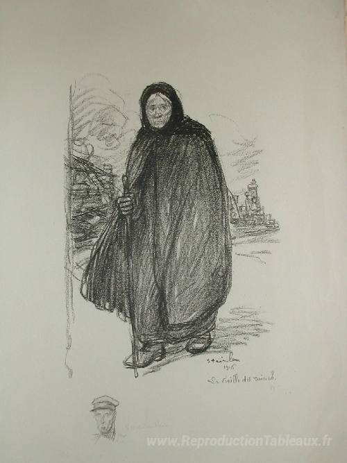 Nous vous proposons une reproduction artisanale sur toile du célèbre tableau 'Vieille femme' de Theophile Steinlen, provenant du Musée de la Reproduction.