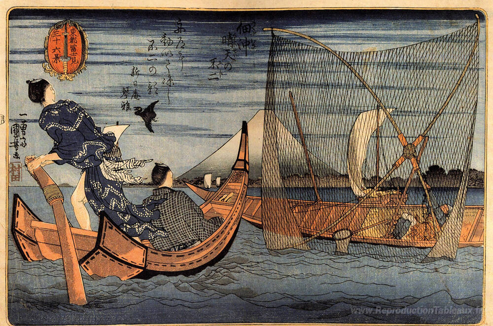 Nous vous proposons une reproduction artisanale sur toile du célèbre tableau 'Vue du mont Fuji' de Utagawa Kuniyoshi, provenant du Musée de la Reproduction.