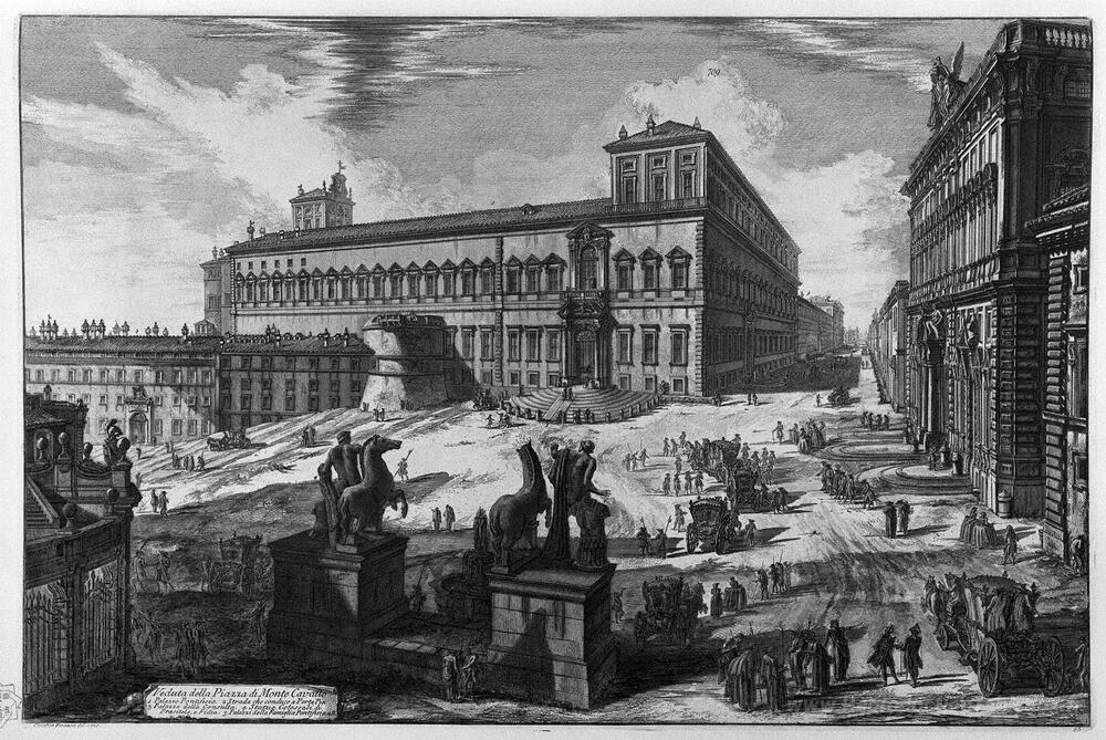 Nous vous proposons une reproduction artisanale sur toile du célèbre tableau 'Vue de la Piazza di Monte Cavallo' de Giovanni Battista Piranesi, provenant du Musée de la Reproduction.
