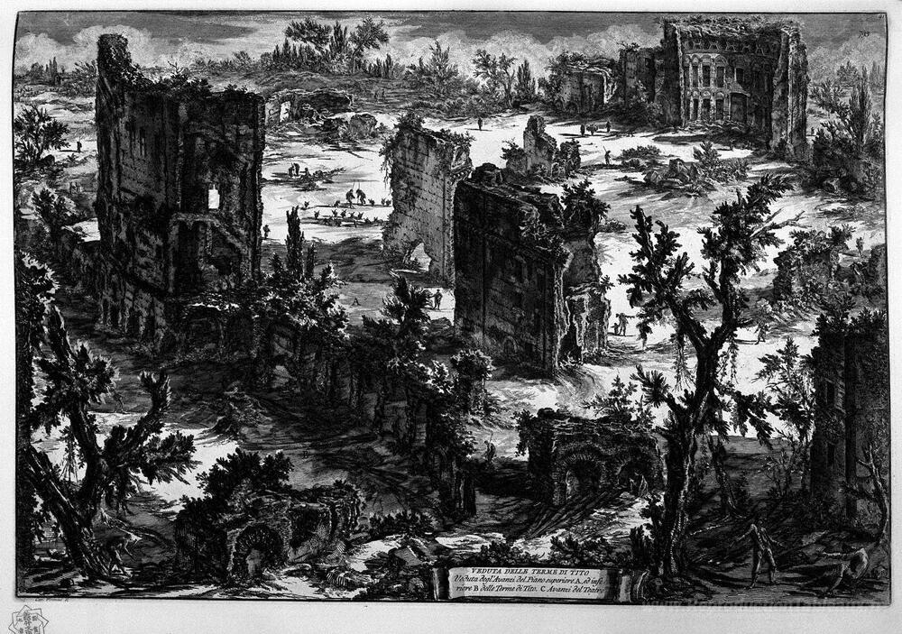 Nous vous proposons une reproduction artisanale sur toile du célèbre tableau 'Vue des bains de Titus' de Giovanni Battista Piranesi, provenant du Musée de la Reproduction.