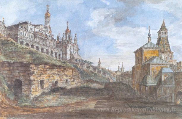 Nous vous proposons une reproduction artisanale sur toile du célèbre tableau 'Vue du palais du souverain et de l'église de l'Annonciation dans' de Fyodor Alekseyev, provenant du Musée de la Reproduction.