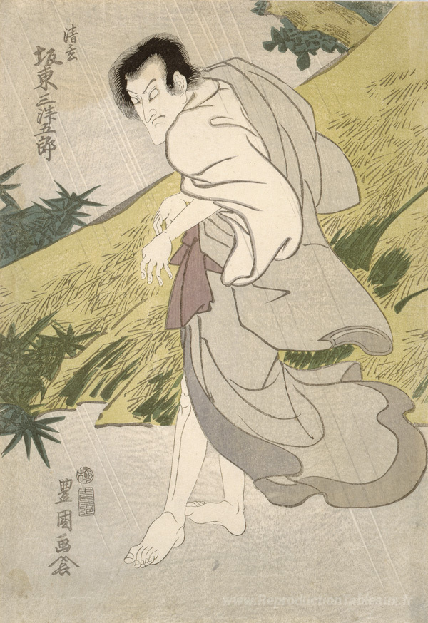 Nous vous proposons une reproduction artisanale sur toile du célèbre tableau 'Acteur Bando Mitsugoro III comme Seigen' de Utagawa Toyokuni, provenant du Musée de la Reproduction.