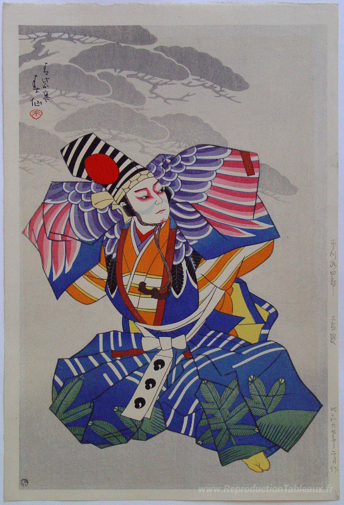 Nous vous proposons une reproduction artisanale sur toile du célèbre tableau 'Ichikawa Danshiro en tant que danseur de Sanbasô en Blue Kimono' de Natori Shunsen, provenant du Musée de la Reproduction.