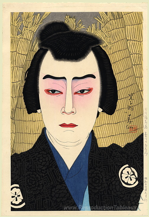 Nous vous proposons une reproduction artisanale sur toile du célèbre tableau 'Sawamura Sojoro comme Narihira Reizo' de Natori Shunsen, provenant du Musée de la Reproduction.